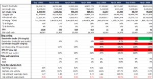 Q4/23: Doanh thu tăng trưởng dương sau 5 quý liên tục âm Q4/23, nhờ vào mức tăng 30% svck của Bách Hóa Xanh, tổng doanh thu ghi nhận mức tăng trưởng dương sau 5 quý âm liên tục, đạt 31,421 tỷ đồng (+2.7% svck). Bên cạnh đấy, sức tiêu thụ hàng không thiết yếu chưa có nhiều cải thiện, doanh thu TGDD & DMX tiếp tục giảm 10% svck. Điếm sáng trong Q4/23 là doanh thu/cửa hàng BHX đã đạt trung bình 1.8 tỷ đồng/cửa hàng (+32% svck) nhờ vào việc đẩy mạnh tiêu thụ mảng thực phẩm tươi sống (+35% svck), nhờ đó doanh thu BHX ghi nhận tăng 30% svck, lỗ ròng của BHX giảm xuống còn 306 tỷ đồng, so với mức 715 tỷ đồng trong Q4/22. Biên LN gộp đạt 19.7% (Q3/23: 18.7%). Tổng hợp, LN ròng Q4/23 đạt 90 tỷ đồng, so với quý liền trước, LN ròng cải thiện 133% nhờ vào việc tiết giảm chi phí. Lũy kế cả năm 2023, LN ròng đạt 168 tỷ đồng, giảm 96% svck